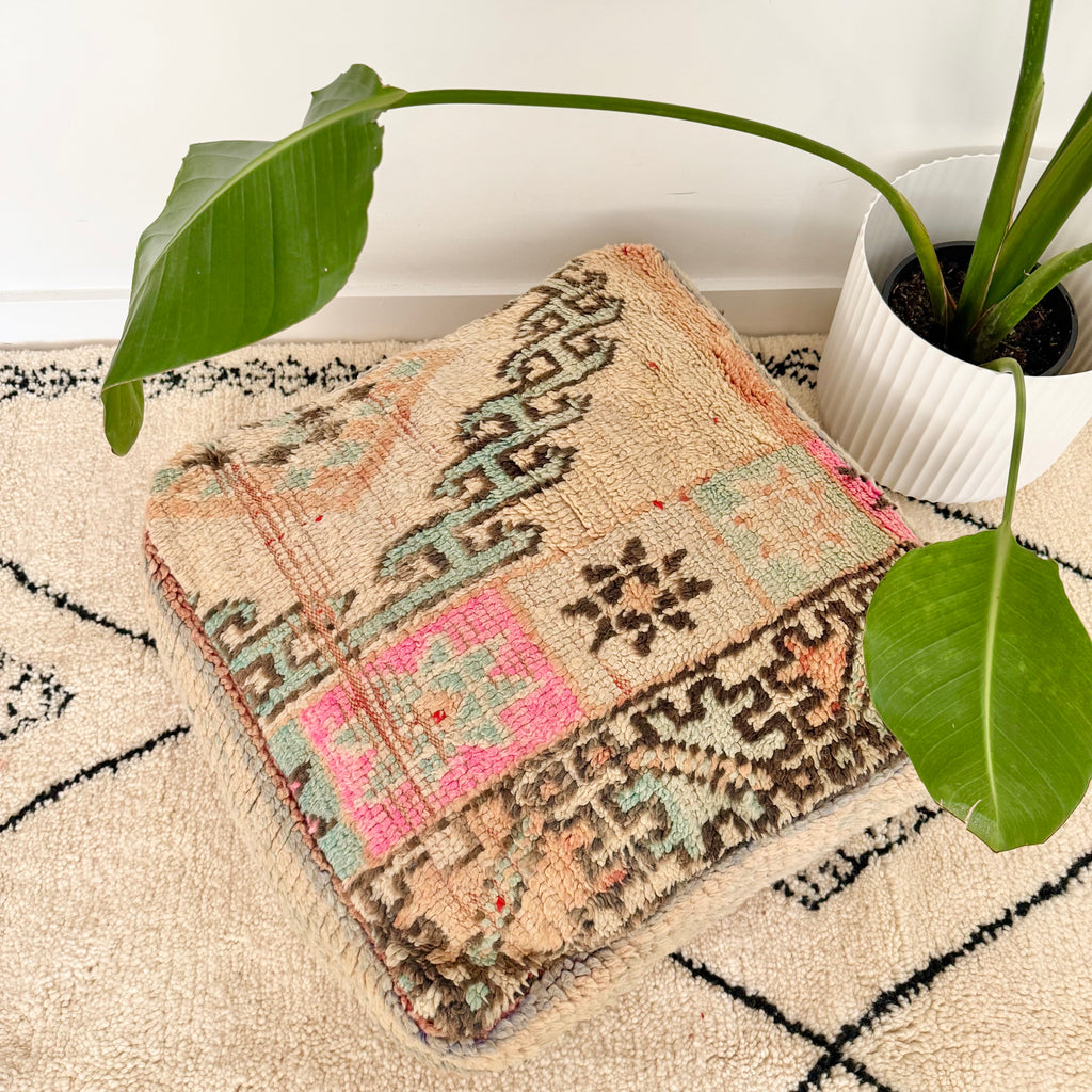 This gorgeous floor cushion has been handmade from a vintage wool rug from Morocco.